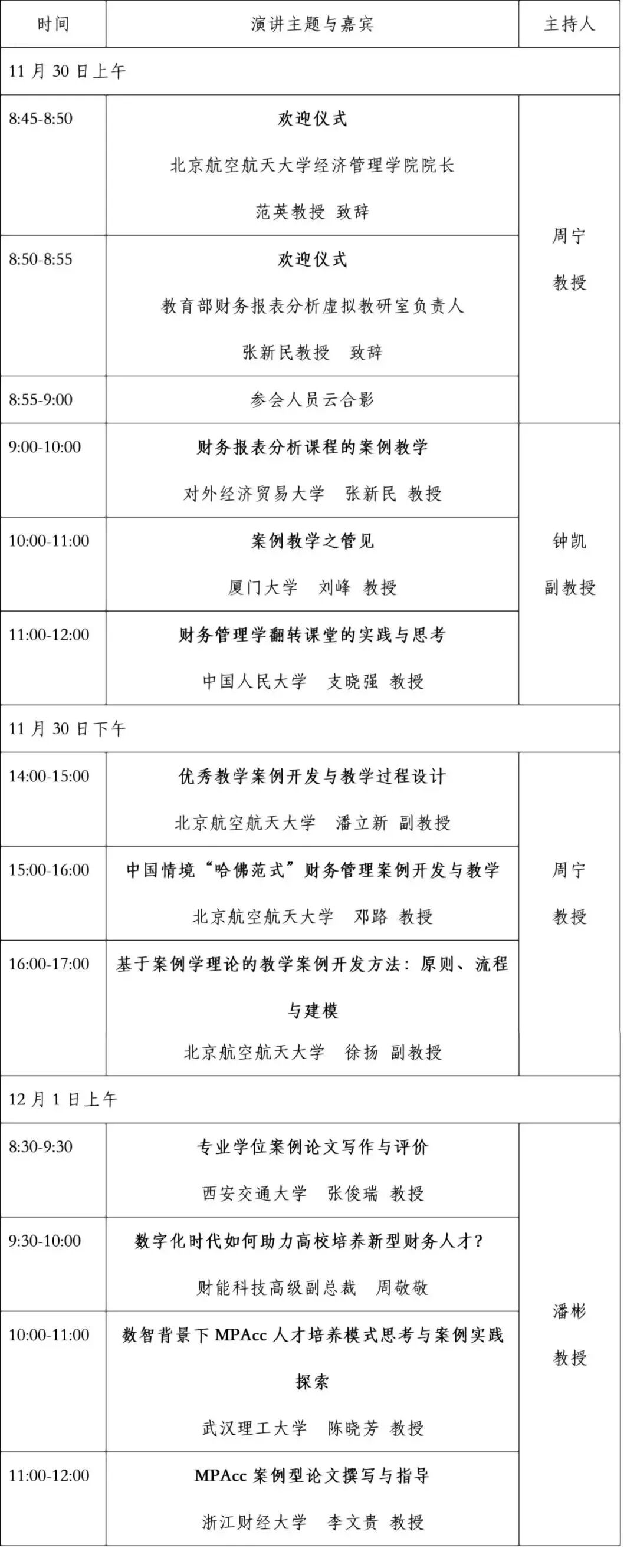 师资培训第三期 | 案例教学与开发专题工作坊发表时间:2022-11-22 16:34 ![]() ![]() 会议主题 本次会议聚焦案例教学与开发,以“强化案例建设,提升人才培养质量”为主题,就会计与财务管理教学活动中的案例教学与开发,以及案例型学位论文写作指导等问题进行分享,提升教师的教学与人才培养水平。 时间:11月30日-12月1日 方式:线上腾讯会议或小鹅通 主办方:教育部财务报表分析课程群虚拟教研室 承办方:北京航空航天大学经济管理学院 协办方:北京财能科技有限公司 工作坊日程: ![]() 1 会议形式 本次会议采取【线上直播】方式进行,专家线上讲授、答疑、研讨。会议结束两周内,参会人员可享受免费在线回看。 2 报名方式 个人可直接扫二维码订阅报名: ![]() 对公转账请汇款至如下账户: 户名:北京财能科技有限公司 开户行:中国民生银行股份有限公司北京三元支行 收款账号:630650927 汇款信息备注:学校+姓名+联系方式 团体报名联系人:张丽君老师 13810063725 3 会议费用 个人报名800元/人,超过4人参会的财务报表分析课程群虚拟教研室的成员单位可以单位形式报名,享受优惠价格3000元/单位。报名成功后可进入直播群,发票请联系会务组老师开具,会议结束后提供结业证书。 【提示】申请加入财务报表分析课程群虚拟教研室成员单位的流程,可咨询对外经济贸易大学钟凯老师(电话:18910635570)。 师资简介 1 张新民教授 ![]() 对外经济贸易大学原副校长,国际商学院原院长,会计学教授,财政部会计名家。 国务院学位委员会工商管理学科评议组成员,中国商业会计学会副会长,国际管理会计教育联盟理事长。 黄大年式教师团队负责人,首个财经类大学国家自然科学研究基金重大课题《互联网时代公司财务行为研究》负责人,教育部财务报表分析课程群虚拟教研室负责人。 长期专注于企业财务报表分析的研究与教学。主编的教材《财务报表分析》获首届国家教材建设一等奖。创立“张氏财报分析框架”,为分析中国企业财务报表分析提供系统解决方案。 2 刘峰教授 ![]() 厦门大学会计发展中心主任、教授、博士生导师。 1987年起在厦门大学任教。研究领域包括会计基本理论、审计、并购与公司治理等。曾在《管理世界》上发表多篇案例研究论文,关于五粮液的案例研究论文,是《管理世界》高被引论文。目前的研究兴趣包括会计与人类文明、数智化与公司财务行为等。 3 支晓强教授 ![]() 中国人民大学商学院教授,博士生导师。中国人民大学杰出学者特聘教授、财务处处长。 先后入选财政部全国会计领军人才、全国会计领军人才培养工程特殊支持计划、会计名家培养工程。兼任全国会计专业学位研究生教育指导委员会秘书长等。 曾多次获得国家级教学成果奖、中国人民大学十大教学标兵等。首批国家级一流本科课程负责人,北京市高等教育教学名师。主持国家自然科学基金等课题。在《管理世界》《会计研究》《金融研究》等期刊发表论文多篇。 4 潘立新副教授 ![]() 北京航空航天大学经济管理学院副教授,会计学博士,中国注册会计师协会非执业会员。 2021年被教育部学位与研究生教育发展中心评为首届“优秀案例教师”,2022年被评为首席案例专家。研究领域集中于利用会计信息的决策行为研究、企业内部控制与审计研究、资本市场的会计审计问题等方面。主讲课程有:《会计学》、《财务报表分析》、《高级财务会计》、《审计理论与实务》等。 以第一作者开发的教学案例9次获得全国MBA“百优”案例奖、1次获得全国会计专业硕士优秀案例奖、1次获得全国金融专业硕士优秀案例奖、2次获得清华大学“卓越案例开发者”奖,入库加拿大毅伟案例库案例1篇,出版案例专著《财务会计案例与分析》。担任全国MBA教指委“百优”评审专家,精品案例课程评审专家、中欧商学院案例中心学科编辑、上海MBA案例教学大赛评审专家。主讲的MBA《会计学》被评为北航研究生精品课程。多次获得北航教学成果奖励,为教育部学位与研究生教育发展中心拍摄案例教学示范视频2部。 5 邓路教授 ![]() 北京航空航天大学经济管理学院会计系教授、博士生导师,北航深圳研究院副院长,University of Southern California访问学者,财政部全国高端会计人才。 主要研究领域:公司财务与资本市场,已在Journal of Corporate Finance、《管理世界》、《管理科学学报》、《金融研究》、《会计研究》等国内外学术期刊发表50余篇学术论文,主持和完成4项国家自然科学基金项目,荣获首届教育部全国优秀教材二等奖、北京市教委课程思政示范课程、教学名师、“北京市普通高等学校优秀本科生毕业论文”优秀指导教师,已完成23篇“哈佛式教学案例”先后荣获全国“百篇优秀管理案例”、全国“MPAcc优秀教学案例”、全国“金融硕士优秀教学案例”。 6 徐扬副教授 ![]() 北京航空航天大学经济管理学院副教授。2018年毕业于北京航空航天大学经管学院金融工程专业,获管理学博士学位。2014年于美国乔治华盛顿大学商学院获得会计学硕士。2012年分别在爱尔兰考克大学经济学院获得经济学专业理学士、北京工商大学商学院获得会计学专业管理学学士。 研究领域:国际金融、实证资产定价、外汇市场、大宗商品。已在Journal of Futures Market, International Review of Financial Analysis, Pacific-Basin Finance Jour